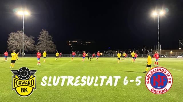 Under torsdagskvällen spelades det träningsmatch mot Karlslunds IF på Trängens IP. En första match av två där returen spelas i december. Syftet var att ge många speltid hos både lagen. Forward inleder matchen starkast och gör tidigt 1-0, redan efter fyra minuter. Därefter väntar en svängig matchbild där var och varnannan chans blir till mål och domaren får febrilt jobba med att anteckna målen. 4-3 till gult och svart efter en halvlek, och till inledningen av den andra har KIF en starkare period där de går upp i ledning med 3-4 men där Forward i slutet kan vända på matchen till seger! Lagets assisterande tränare Oliver Bäckström kommenterade följande efter matchen: - Ville man se på ett målkalas så hade man hamnat rätt då 11 bollar hamnat i nät när domaren blåste av matchen. En match där vi startar starkt och tar väldigt tidigt en 3-1 ledning vilket känns väldigt lugnt och tryggt. Därefter hände någonting och vi blev yra i samtliga lagdelar och slutade jobba tillsammans. Vi kliver ut till andra halvlek enade om att vi ska jobba mer kompakt och vara mer spelbara för varandra. Det gick både bra och dåligt eftersom vi släppte in två mål till i andra halvlek. Vi får glädja oss över en vinst och sex gjorda mål. Det negativa delarna tar vi med oss och jobbar vidare på. Med andra ord fick de som trotsade kylan denna kväll valuta för mödan och kunde bevittna en match som nog inte går till historien som den mest välspelade, men för det ingen tråkig match! Målglad fotboll går alltid hem och särskilt en kall och mörk novemberkväll. Vi säger tack för god match till KIF och på återseende den 9 december när returen spelas på KIF Arena! #Slutresultat BK Forward U19 - Karlslunds IF U19 6-5 (4-3) 1-0 Viktor Regin 4' (assist Erik Rolland) 1-1 KIF 5' 2-1 8' Kafi Abdirizak 3-1 14' Leon Yesil (provspelare) 3-2 KIF 25' 3-3 KIF 31' 4-3 Filip Paavola xx' (assist Noel Acar) 4-4 KIF 57' 4-5 KIF 60' 5-5 Divin Don Shikaneza xx' 6-5 Emrah Zehic 90' (Neo Meijer-Persson) #Startelvan Filip Ormegard (MV)- Anton Lillhager, Erik Rolland (45'), Emrah Zehic (K)- Noel Acar (ut 45' in 65'), Elias Ekberg, Neo Meijer-Persson, Filip Paavola (65')- Viktor Regin, Kafi Abdirizak (ut 45' in 69') Avbytare: Divin Don Shikaneza (45'), Husein Ovie Jalloh (45'), Abdenor Ghennam (45'). #Nästa match IF Karlstad (b) i ligacupen nu på söndag kl 15:00.