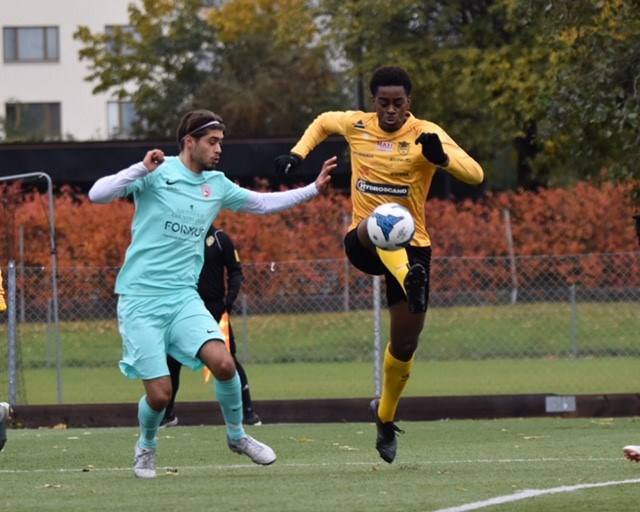 Under söndagen var det så dags för den näst sista omgången av P19 Superettan Norra och den sista hemmamatchen på Trängens IP när FC Djursholm kom på besök. Det blev då en jämn tillställning där båda lagen fick med sig en poäng var, där vi nog får ses som vinnare av en poäng då vi hämtar upp ett 0-3 underläge! Inför matchen hölls det en tyst minut efter det tragiska som skedde i Bryssel tidigare under veckan som chockat svensk fotboll*. När domaren blåser igång matchen är det motståndarlaget som har mest boll och skapar ett par chanser. Vi får således rikta in oss på försvar och efter tio minuter får de in bollen i straffområdet, spelar lite kvadraten med våra försvarsspelare och kan sedan enkelt placera in bollen i nät bakom en chanslös Hugo och det står 0-1. En matchbild vi känner igen...Deras andra mål kommer efter ytterligare knappa tio minuter där de slår en längre boll över vår backlinje där de något enkelt smyger sig bakom och kan även här bara placera in bollen. 0-2 i halvtid och vi känner att vi ändå är bra med i matchen. I försvarsspelet står vi kompakt som vi tränat på och det är typ bara på målen som de kommer emellan oss. Djursholm uppträder under den första halvlekens gång som mer och mer frustrerade och vi behöver jobba vidare för att så småningom kunna bryta ner dem och vända på matchen. Till den andra halvleken dröjer det till minut 61 innan målprotokollet uppdateras, FC Djursholm gör mål och ser ut att stänga matchen med sitt 0-3 mål. I vanliga fall är matchen stängd men idag är inte en sådan dag, utan ville vi annat och påbörjade en jakt på reducering! Inte långt senare gör Eli vårt första mål i matchen när han framspelas av Elias och fint kan placera bollen i mål. Ett litet hopp tänds och det blir än större när Elias slår en fin djupledspassning genom motståndets backlinje till Eli som återigen behärskat avslutar bollen i nät bakom en chanslös motståndarmålvakt. I minut 77 fullbordar vi vändningen, Eli är återigen framme och nickar denna gång in bollen (assist på Abbe) i nät och han fullbordar då även sitt hattrick! Efter detta jobbar Djursholm på mot vårt mål för att återta ledningen och vi kämpar mot klockan då vi har slutkörda ben på många håll. De har ett par vassa chanser men Hugo i mål räddar oss flera gånger om och vi kan hålla ut och säkra en poäng i matchen. Matchen slutar 3-3 och får ses som rättvist, vi gör en bra kämpainsats och kan tillslut få lite utdelning på vårt hårda jobb i försvarsspelet. Skönt att avsluta med en stark poäng på hemmaplan! #Slutresultat BK Forward-FC Djursholm 3-3 (0-2). Matchhändelser: 0-1 FCD 10’ 0-2 FCD 19’ Gult kort Vincent 23’ Gult kort Eli + FCD 44’ 0-3 FCD 61’ 1-3 Eli (Elias) 66’ 2-3 Eli (Elias) 69’ 3-3 Eli (Abbe) 77’ Startelvan: Hugo Mosshagen (MV) - Abdullahi Abduwalli, Emrah Zehic (K), Aran Kakei, Vincent Halonen (77’) - Jethro Landu (66’ in igen 85’) - Eli Nzau, Algot Enghag (85’), Elias Ekberg, Neo Meijer Persson - Filip Paavola (66’) Avbytare: Hamid Alizada (77’), Benjamin Blazevic (66’), Mio Sörling (66’) #Tre saker vi tar med oss från matchen: #Bra laginsats där vi jobbar hårt i försvarsspelet som bäddar för att vi kan hämta upp underläge till oavgjort. Vi stängde ner deras ytor bra bortsett från på målen. #Bra individuella prestationer vid alla tre målen, både i form av avslut och framspelningar. #Det kollektiva försvarsspelet var bra men utan en duktig målvakt i målet hade det nog inte gått. Hugo gör flertalet svettiga räddningar och ska ha en eloge för det! #Motståndarkollen P19 Superettan Norra: Från den näst sista omgången kan vi hämta in följande resultat: BP-Täby FK 2-1, IK Frej Täby- Degerfors IF 3-1, GIF Sundsvall- IK Sirius 5-2, väldigt viktig seger för Sundsvall. Vasalunds IF - IFK Lidingö 1-1, Smedby AIS- IK Brage 2-2 och IFK Stocksund-IFK Haninge 2-0. Detta gör för tabellen att GIF Sundsvall leder med 58 poäng, tätt följt numera av IFK Stocksund på 57 poäng och IK Sirius som länge såg ut att ha säkrat sin plats i Allsvenskan är nu trea med 55 poäng. Det blir därmed en spännande sista omgång som väntar nästa helg! I botten av tabellen är det oförändrat. #Nästa match: Täby FK på bortaplan 13:00 den 29 oktober. #På bilden: Dagens tremålsskytt in action! Fler matchbilder finns här på hemsidan. *Dagens match inleddes med en tyst minut för att hedra minnet av de två svenska supportrarna som blev utsatta för ett attentat inför landskampen Belgien-Sverige i Bryssel tidigare i veckan (måndags). Våra tankar gick till de drabbades familj och vänner.