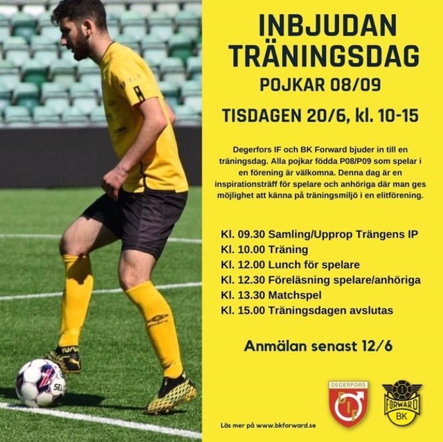 Degerfors IF och BK Forward bjuder in till en träningsdag. Alla pojkar födda P08/P09 och som spelar i en förening är välkomna. Denna dag är en inspirationsträff för spelare och anhöriga, där man ges möjligheter att känna på träningsmiljö i en elitförening. Schema för dagen Trängens IP B-plan tisdag 20 juni kl. 09.30 – 15.00 09.30 Samling/Upprop Trängens IP 10.00 Träning 12.00 Lunch för spelare 12.30 Föreläsning Spelare/Anhöriga 13.30 Matchspel 15.00 Träningsdagen avslutas Ledare: Henrik Andersson NIU-ansvarig/P17-tränare DIF Rickard Nilsson NIU-utbildare/A-lagstränare BKF Mikael Eklund NIU-utbildare/P19-tränare DIF Elias Levi Utvecklingsansvarig DIF Jacob Brehmer, P19-tränare BKF Ramazan Rashid, P16-tränare BKF Anmälan senast 12/6 till Akademiansvarig Degerfors IF peter.palmqvist@degerfors.if Ange namn – förening – position – antal anhöriga Övrig information: Jimi Högfeldt Akademiansvarig BK Forward hogfeldt17@gmail.com