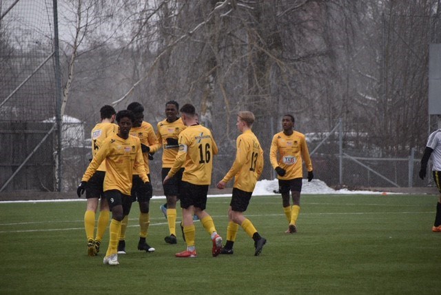 Igår träningsspelade vi mot Skiljebo SK U19 på Trängens IP. Att matchen ens skulle bli av var vi lite oroliga för då snön vräkte ner under lördagen och tvingade flera lag i Örebro att ställa in sina matcher under lördagen. Men på söndagen var det uppehåll och bra förutsättningar för att spela boll på! Motståndarna inleder matchen starkt, de sätter hög press som vi får svårt att spela oss ur och i stressen som uppstår tappar vi en del boll på egen planhalva. Men motståndarna kan också tappa bollen och Jethro var uppmärksam på det och gjorde vackert 1-0 i den 15:e matchminuten. Därefter dröjde det ca tio minuter innan Skiljebo gjorde 1-1. Därefter mot slutet av första halvlek tilldelas vi en straff då Skiljebos målvakt fäller Abbe i straffområdet. Domaren tog fram det röda kortet men vi var snabba med att se till att målvakten fick stå kvar. Fördelen med träningsmatcher är att man kan styra förutsättningarna lite, det är mycket roligare om vi kan spela 11 mot 11 (Skiljebo hade dessutom ingen reservmålvakt med)! Abbe förvaltade straffen säkert och vi gick in i halvtid med 2-1 ledning. Inför andra halvlek fokuserade vi mer på att lösa uppspelen, och fortsätta ligga rätt i försvarsspelet. Det skulle visa sig fungera, och tio minuter in i andra halvlek serverar Abbe ett fint inlägg som går över hela Skiljebos backlinje till Olle som löpt in i straffområdet. Olle väljer att avsluta med kraft på ganska nära håll. Rekommendationen från tränare brukar vara att placera bollen…men varför det tänkte Olle och dunkar in bollen i närmsta krysset, med lite hjälp av ribban. En kandidat till årets mål (såhär långt, förhoppningsvis får vi fler kandidater)! Under tiden har snön börjat falla över planen, det påverkar dock inte spelet nämnvärt, men ger en stämningsfull inramning på matchen. Mot slutet av halvleken gör Skiljebo 3-2 när vi slarvar lite i försvaret, men när domaren blåser av kan vi konstatera att vi vinner matchen! Sammanfattningsvis en bra och jämn match, Skiljebo har mest boll och vi får försvara mycket. Skiljebo hade ett helt gäng med målchanser, och kunde ha gjort 4-5 mål (Noor gör dock många bra räddningar), vi var effektivare i offensivt straffområde. Återigen så är det en bra träningsmatch som ger svar på vad vi gör bra och vad vi kan utveckla framöver! Som enskild prestation får vi vara nöjda utifrån förutsättningar! Våren har gått fort, seriepremiären är nu bara fem dagar bort. Vi får hoppas att vi är redo för det, försäsongen har kanske inte varit perfekt då vi har haft en del skador på viktiga spelare, en helt ny trupp där relationer på planen ska skapas, lära sig ett nytt arbetssätt, och många nya rutiner runt omkring som ska sättas. Men det är en del i våran utveckling och vi ser verkligen fram emot seriepremiären som väntar nu på lördag! Matchhändelser av vårat intresse: 1-0 Jethro 15' 1-1 Skiljebo 25' Rött kort Skiljebos målvakt (men han fick stå kvar) 41' 2-1 Abbe (straff) 43' 3-1 Olle (Abbe) 50' Gult kort Carmi (U17) 85' 3-2 Skiljebo 88' På bilden: Laget firar Jethros 1-0 mål. Fler matchbilder finns här på hemsidan. Full fart framåt! Snart dags för seriepremiär!!!