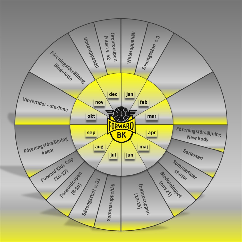 Följande bild visar en översikt över BK Forwards övergripande aktiviteter under året. Årshjulet ger en tydlig inblick och sammanfattar allt vi gör för våra medlemmar, spelare och förening för att driva en välfungerande verksamhet. Utöver detta finns det så mycket mer som fyller ett år – minnen, skratt och gemenskap. Årshjulet ger en riktning och ett ramverk för hur månaderna ser ut, men det är människorna och upplevelserna som gör varje år unikt. BK FORWARD!