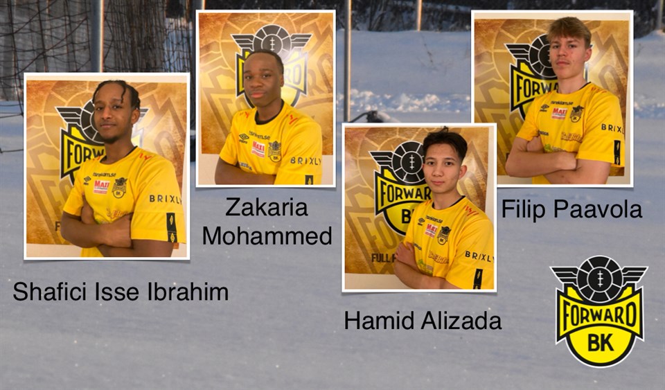 Vi kan nu presentera hela fyra nya spelare som blivit klara senaste veckan. Vi säger hej och välkomna till Shafici Isse Ibrahim, Zakaria Mohammed, Hamid Alizada och Filip Paavola! Presentationer har sen tidigare gått ut på vår Instagram, @bkforward_u19 men nu är det dags för hemsidan också! Fyra spännande spelare som direkt har kommit bra in i laget och som visar på bra inställning under träningarna! Vi hoppas att dessa spelare kan bidra med sina kvalitéer på planen och öka konkurrensen i truppen! Givetvis så har även dessa spelare fått frågan om hur det känns att börja i laget? Shafici: - Det känns verkligen spännande att börja i BK Forward U19. Jag ser fram emot att lära känna alla och börja utvecklas tillsammans med laget. Zakaria: - Det känns riktigt bra för jag är redan vän med de flesta i laget så vi har redan en bra kemi med varandra. Hamid: - Det känns fantastiskt kul att få tillhöra BK Forward. Jag har höga mål med min fotboll och här har jag möjligheter att kunna utvecklas så mycket som möjligt. Filip: - Det känns väldigt bra att börja i BK Forward och det känns som ett steg i rätt riktning för min utveckling. Jag ser fram emot en bra säsongen med laget. Både jag och Krister som tränare är nöjda med att vi kunnat knyta till oss dessa fyra spelare. De har kommit in och direkt visat på bra inställning och en hunger i att vilja utvecklas, och det är precis vad vi vill se. Bra för laget och det skapar en positiv konkurrenssituation! Vi ser fram emot att få följa deras utveckling hos oss under säsongen! Vi säger återigen varmt välkomna till laget och vi hoppas att ni ska trivas hos oss! Mvh /Jacob & Krister